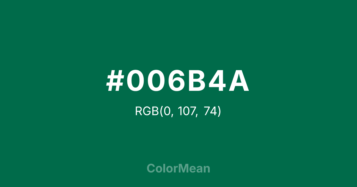 #006B4A RGB value is (0, 107, 74). The hex color red value is 0, green is 107, and blue is 74. Its HSL format shows a hue of 161°, saturation of 100 percent, and lightness of 21 percent. The CMYK process values are 100 percent, 0 percent, 31 percent, 58 percent.