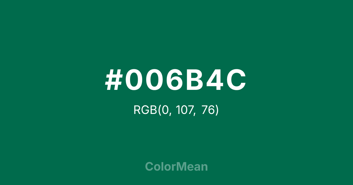 #006B4C RGB value is (0, 107, 76). The hex color red value is 0, green is 107, and blue is 76. Its HSL format shows a hue of 163°, saturation of 100 percent, and lightness of 21 percent. The CMYK process values are 100 percent, 0 percent, 29 percent, 58 percent.