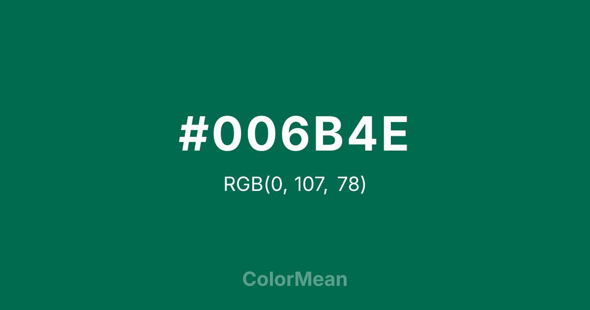 #006B4E RGB value is (0, 107, 78). The hex color red value is 0, green is 107, and blue is 78. Its HSL format shows a hue of 164°, saturation of 100 percent, and lightness of 21 percent. The CMYK process values are 100 percent, 0 percent, 27 percent, 58 percent.