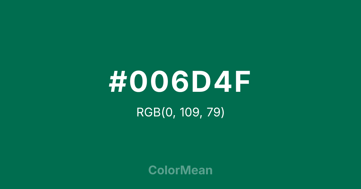 #006D4F RGB value is (0, 109, 79). The hex color red value is 0, green is 109, and blue is 79. Its HSL format shows a hue of 163°, saturation of 100 percent, and lightness of 21 percent. The CMYK process values are 100 percent, 0 percent, 28 percent, 57 percent.