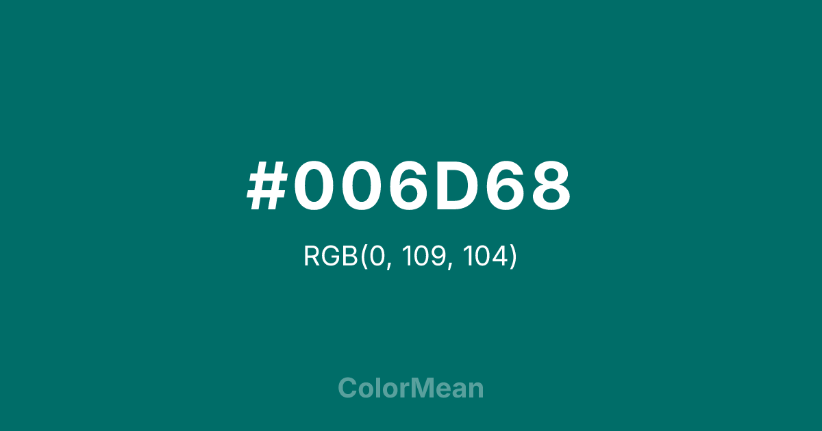 #006D68 RGB value is (0, 109, 104). The hex color red value is 0, green is 109, and blue is 104. Its HSL format shows a hue of 177°, saturation of 100 percent, and lightness of 21 percent. The CMYK process values are 100 percent, 0 percent, 5 percent, 57 percent.