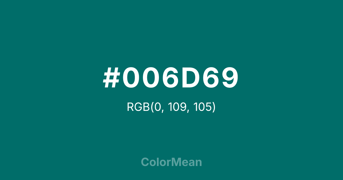 #006D69 RGB value is (0, 109, 105). The hex color red value is 0, green is 109, and blue is 105. Its HSL format shows a hue of 178°, saturation of 100 percent, and lightness of 21 percent. The CMYK process values are 100 percent, 0 percent, 4 percent, 57 percent.