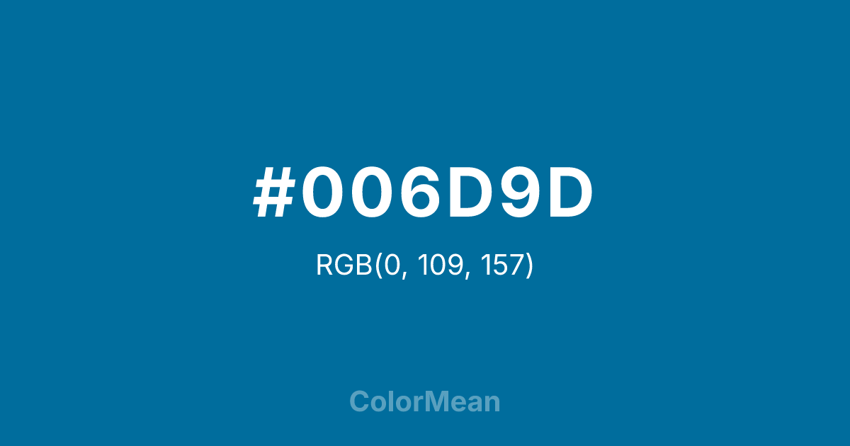 #006D9D RGB value is (0, 109, 157). The hex color red value is 0, green is 109, and blue is 157. Its HSL format shows a hue of 198°, saturation of 100 percent, and lightness of 31 percent. The CMYK process values are 100 percent, 31 percent, 0 percent, 38 percent.