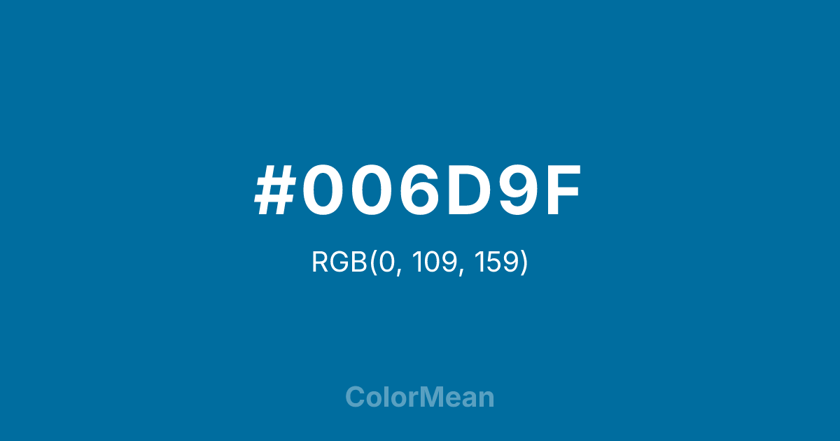 #006D9F RGB value is (0, 109, 159). The hex color red value is 0, green is 109, and blue is 159. Its HSL format shows a hue of 199°, saturation of 100 percent, and lightness of 31 percent. The CMYK process values are 100 percent, 31 percent, 0 percent, 38 percent.