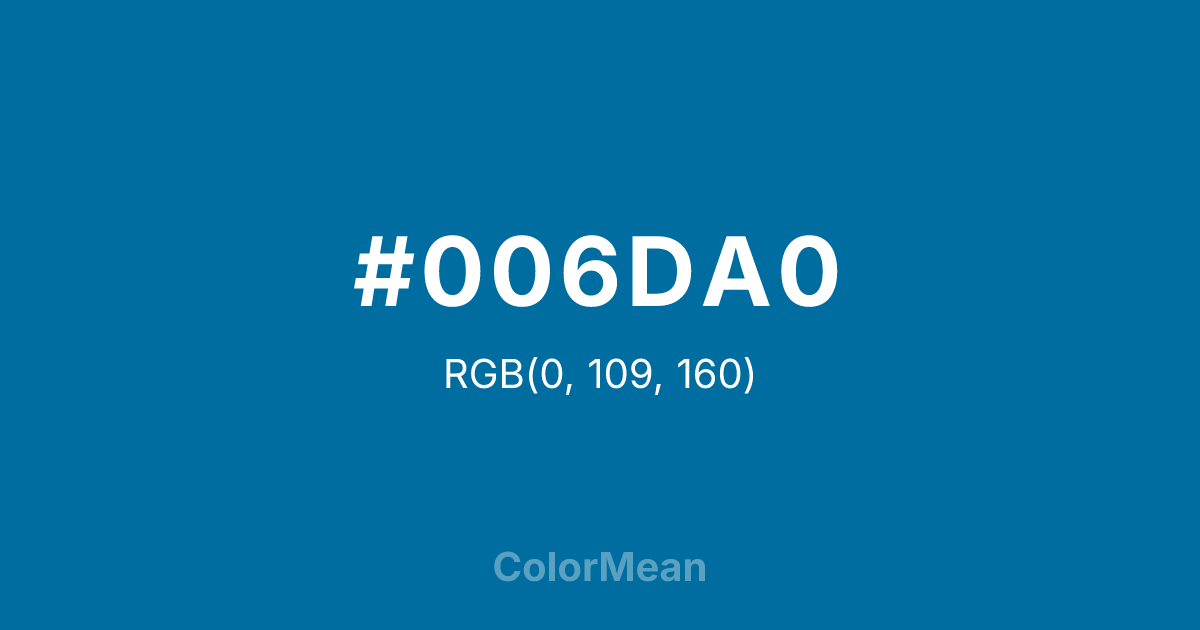#006DA0 RGB value is (0, 109, 160). The hex color red value is 0, green is 109, and blue is 160. Its HSL format shows a hue of 199°, saturation of 100 percent, and lightness of 31 percent. The CMYK process values are 100 percent, 32 percent, 0 percent, 37 percent.