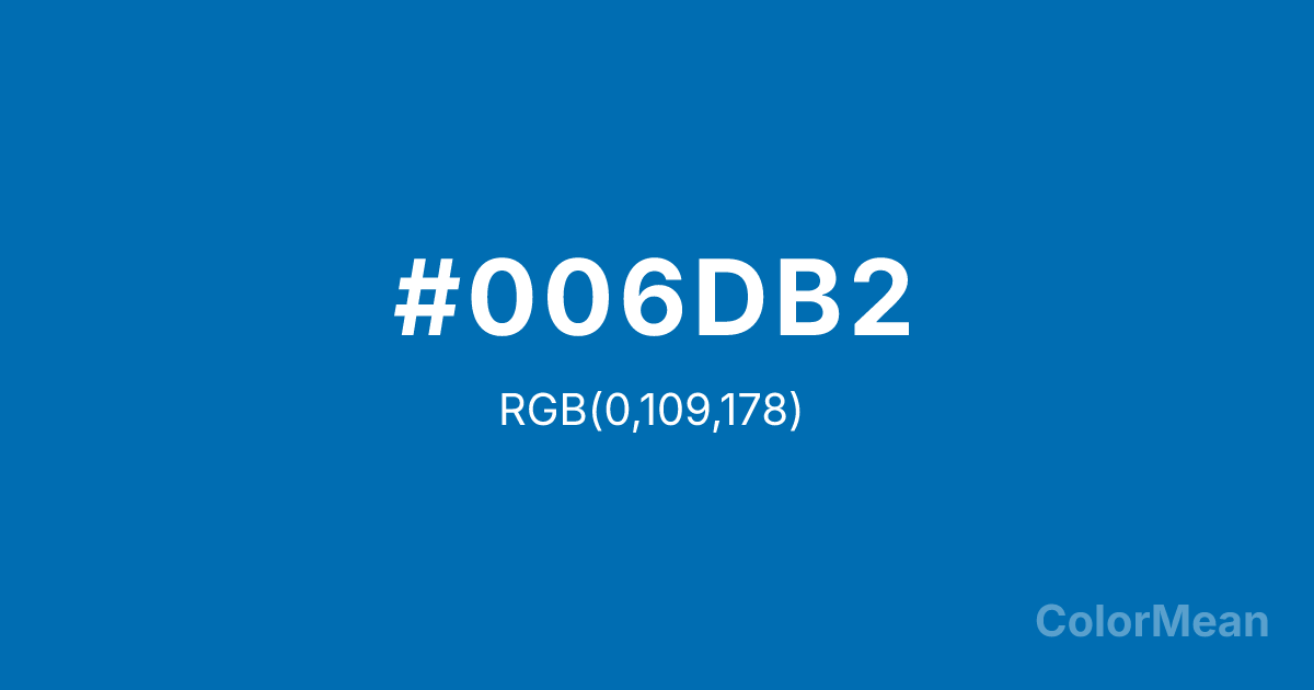 #006DB2 RGB value is (0, 109, 178). The hex color red value is 0, green is 109, and blue is 178. Its HSL format shows a hue of 203°, saturation of 100 percent, and lightness of 35 percent. The CMYK process values are 100 percent, 39 percent, 0 percent, 30 percent.