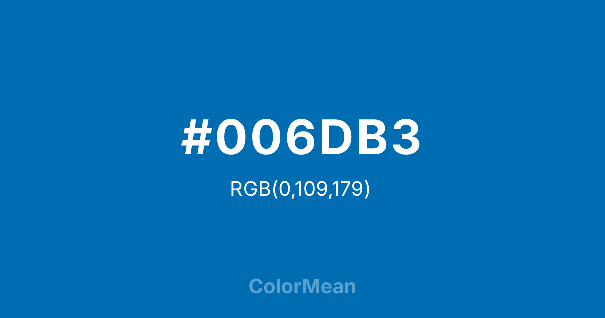 #006DB3 RGB value is (0, 109, 179). The hex color red value is 0, green is 109, and blue is 179. Its HSL format shows a hue of 203°, saturation of 100 percent, and lightness of 35 percent. The CMYK process values are 100 percent, 39 percent, 0 percent, 30 percent.