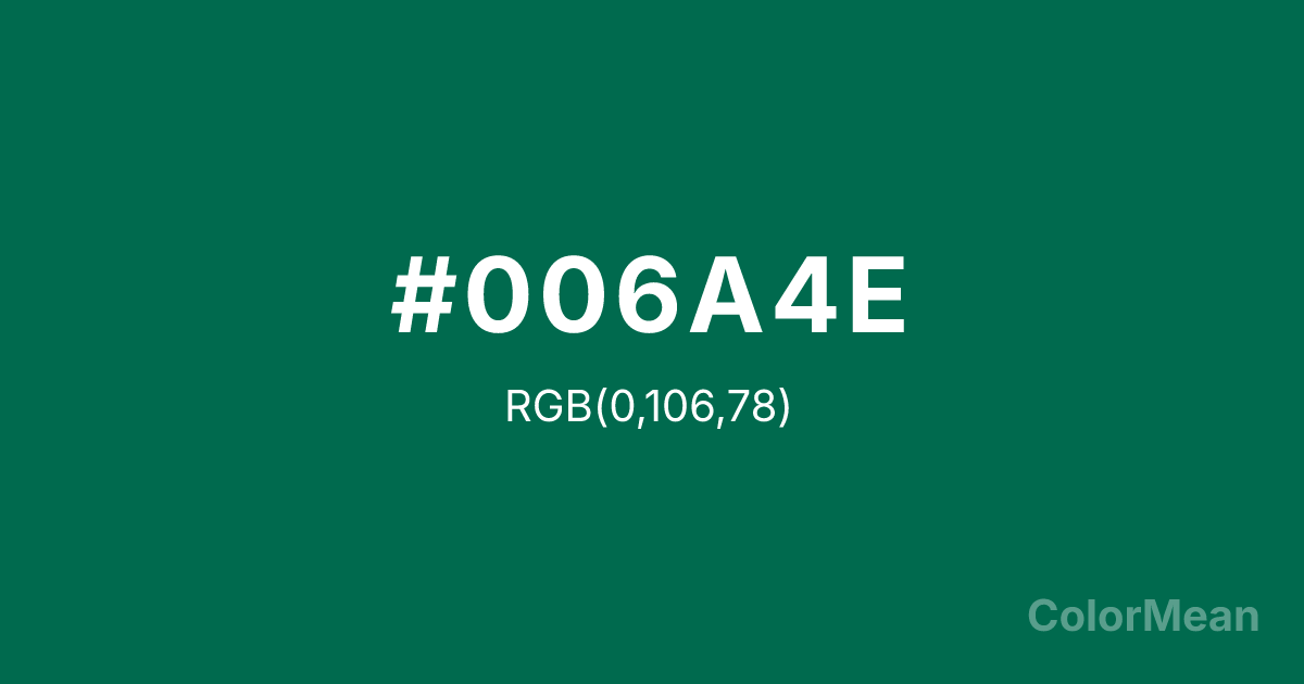 Bottle Green (#006A4E) RGB value is (0, 106, 78). The hex color red value is 0, green is 106, and blue is 78. Its HSL format shows a hue of 164°, saturation of 100 percent, and lightness of 21 percent. The CMYK process values are 100 percent, 0 percent, 26 percent, 58 percent.