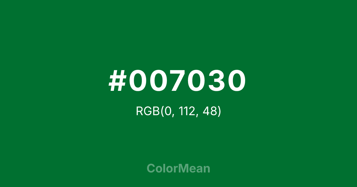 #007030 RGB value is (0, 112, 48). The hex color red value is 0, green is 112, and blue is 48. Its HSL format shows a hue of 146°, saturation of 100 percent, and lightness of 22 percent. The CMYK process values are 100 percent, 0 percent, 57 percent, 56 percent.
