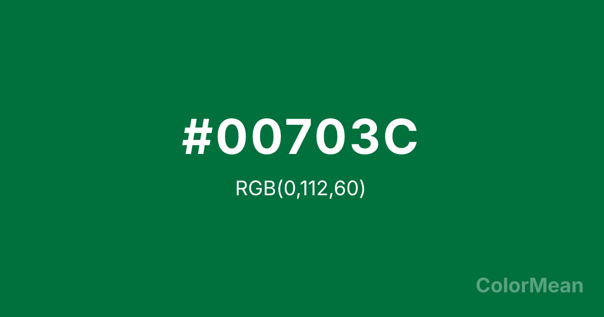 Dartmouth Green (#00703C) RGB value is (0, 112, 60). The hex color red value is 0, green is 112, and blue is 60. Its HSL format shows a hue of 152°, saturation of 100 percent, and lightness of 22 percent. The CMYK process values are 100 percent, 0 percent, 46 percent, 56 percent.