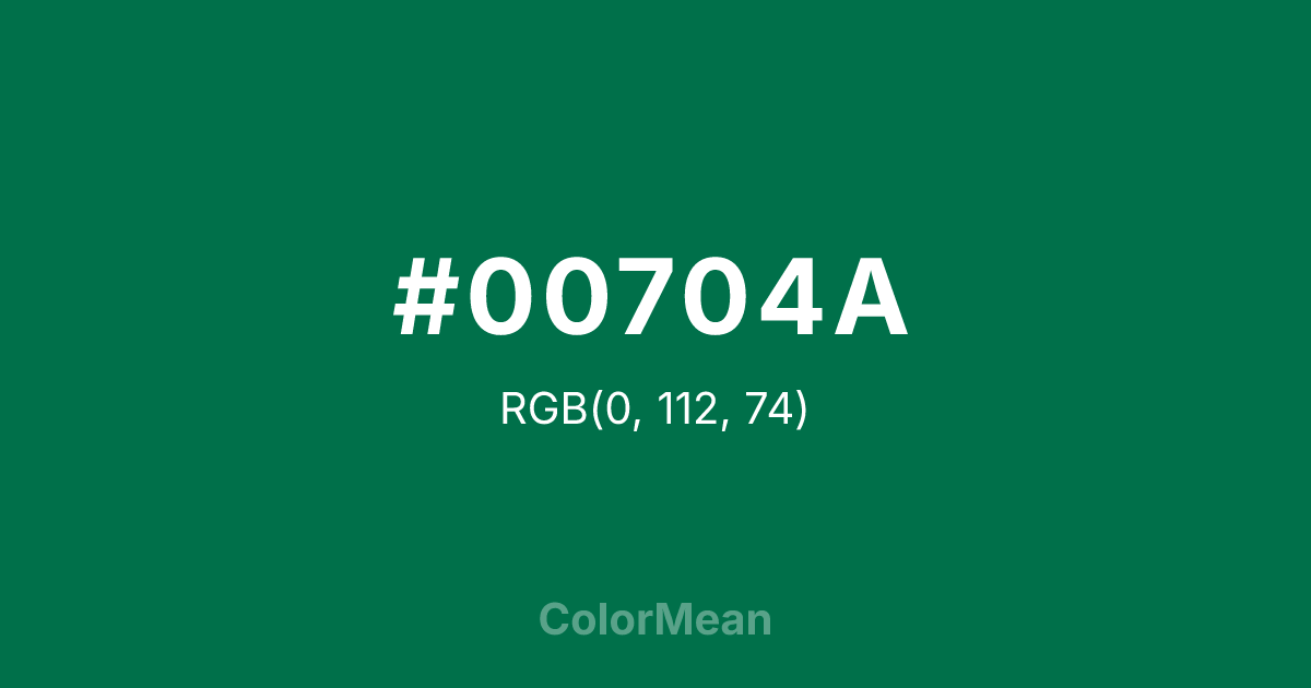 #00704A RGB value is (0, 112, 74). The hex color red value is 0, green is 112, and blue is 74. Its HSL format shows a hue of 160°, saturation of 100 percent, and lightness of 22 percent. The CMYK process values are 100 percent, 0 percent, 34 percent, 56 percent.