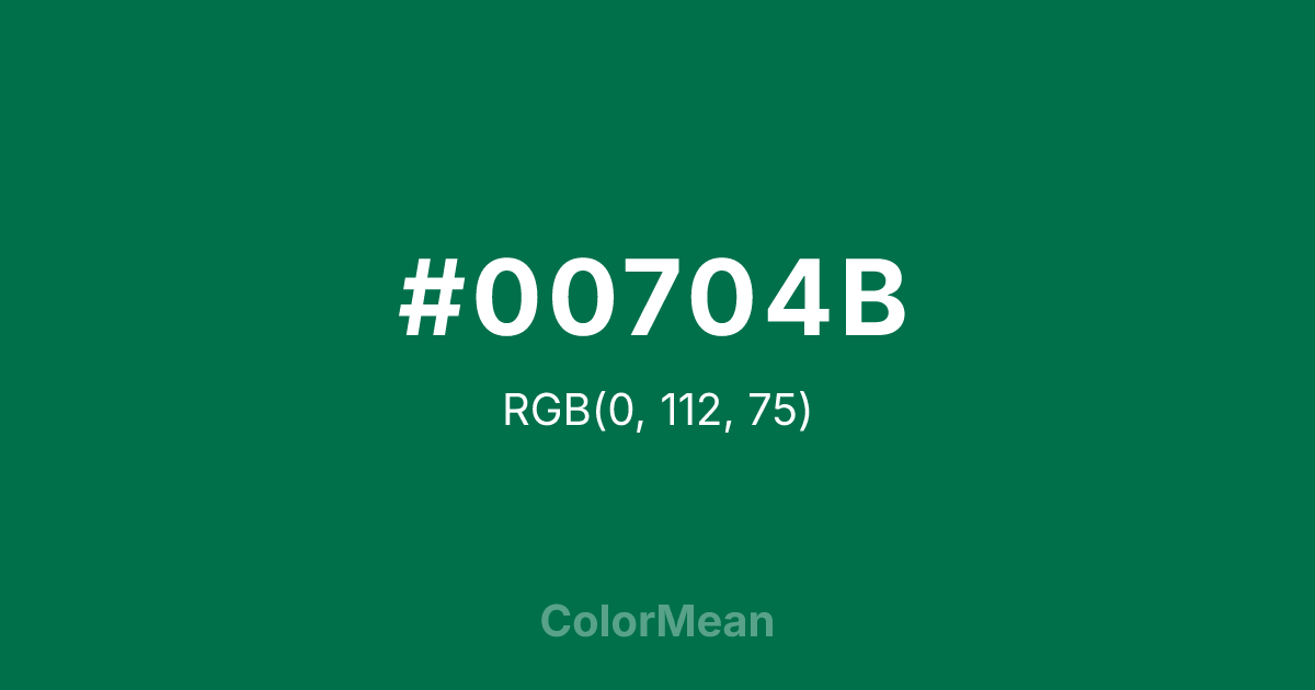 #00704B RGB value is (0, 112, 75). The hex color red value is 0, green is 112, and blue is 75. Its HSL format shows a hue of 160°, saturation of 100 percent, and lightness of 22 percent. The CMYK process values are 100 percent, 0 percent, 33 percent, 56 percent.