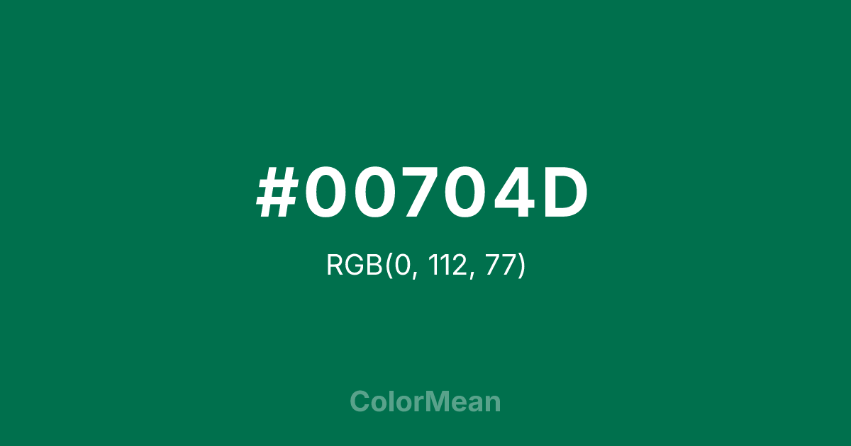 #00704D RGB value is (0, 112, 77). The hex color red value is 0, green is 112, and blue is 77. Its HSL format shows a hue of 161°, saturation of 100 percent, and lightness of 22 percent. The CMYK process values are 100 percent, 0 percent, 31 percent, 56 percent.