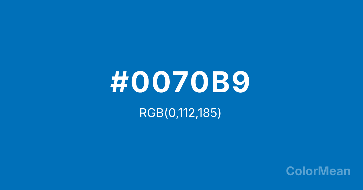 #0070B9 RGB value is (0, 112, 185). The hex color red value is 0, green is 112, and blue is 185. Its HSL format shows a hue of 204°, saturation of 100 percent, and lightness of 36 percent. The CMYK process values are 100 percent, 39 percent, 0 percent, 27 percent.