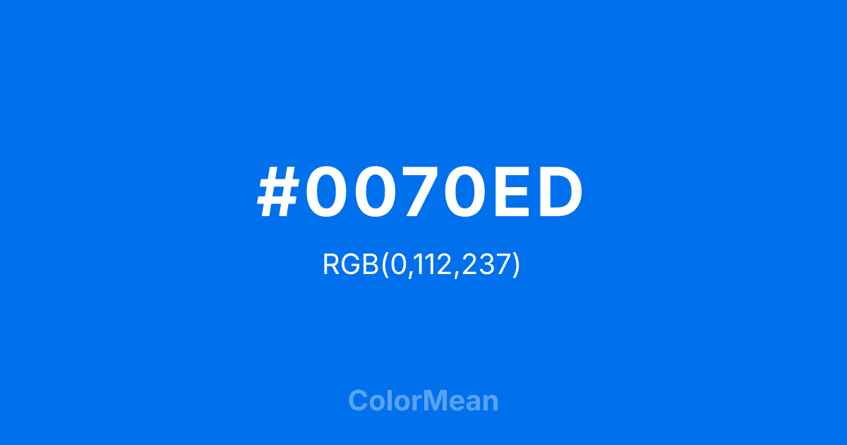 #0070ED RGB value is (0, 112, 237). The hex color red value is 0, green is 112, and blue is 237. Its HSL format shows a hue of 212°, saturation of 100 percent, and lightness of 46 percent. The CMYK process values are 100 percent, 53 percent, 0 percent, 7 percent.