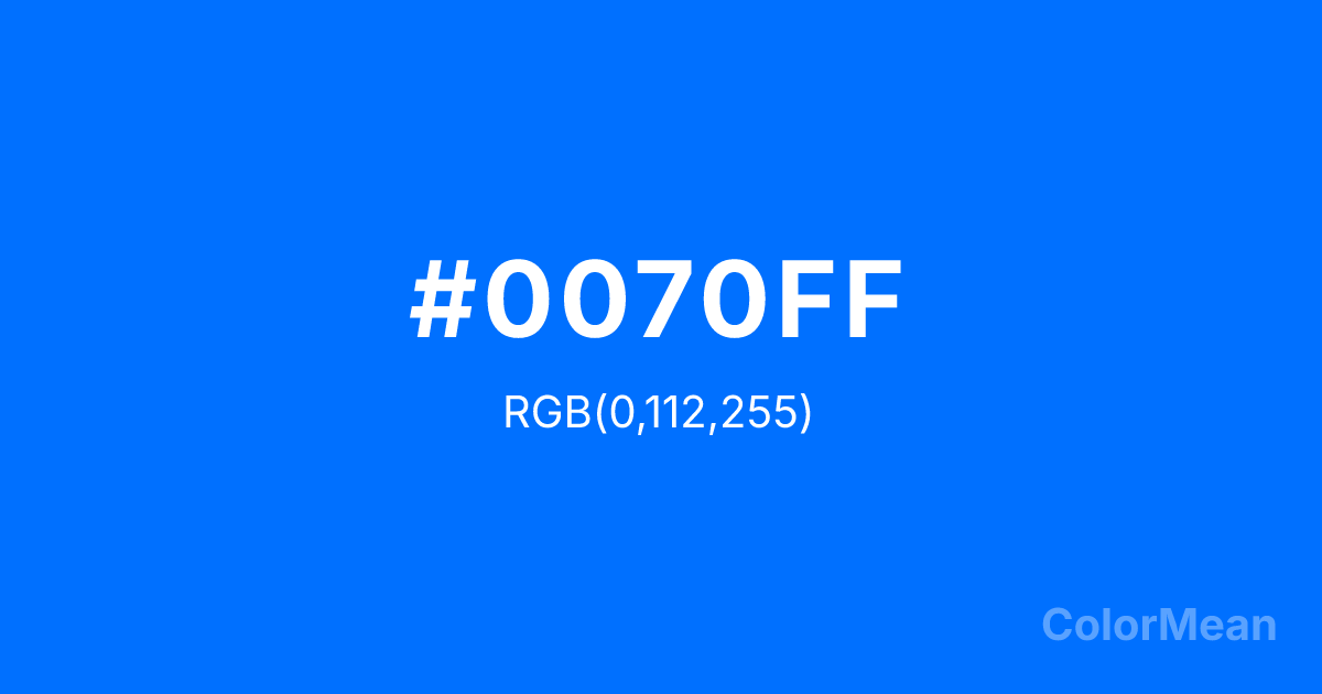 Brandeis Blue (#0070FF) conveys clarity, intellectual focus, and calm energy. In color psychology, it promotes reflective thinking, attentive observation, and emotional stability. Across cultures and history, Brandeis Blue (#0070FF) has been used in academic symbolism, design, and art, representing trust, authority, and visual clarity. From a spiritual perspective, Brandeis Blue (#0070FF) embodies mindful awareness, deliberate reflection, and steady engagement. It encourages thoughtful observation and balanced decision making.
