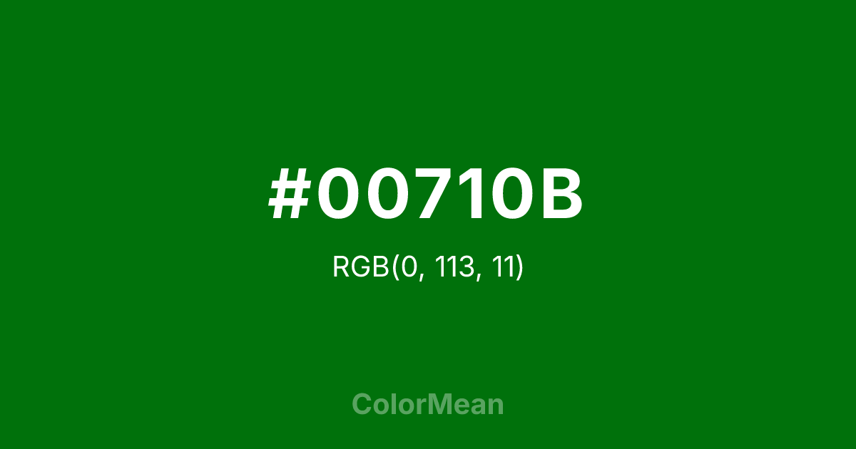 #00710B RGB value is (0, 113, 11). The hex color red value is 0, green is 113, and blue is 11. Its HSL format shows a hue of 126°, saturation of 100 percent, and lightness of 22 percent. The CMYK process values are 100 percent, 0 percent, 90 percent, 56 percent.