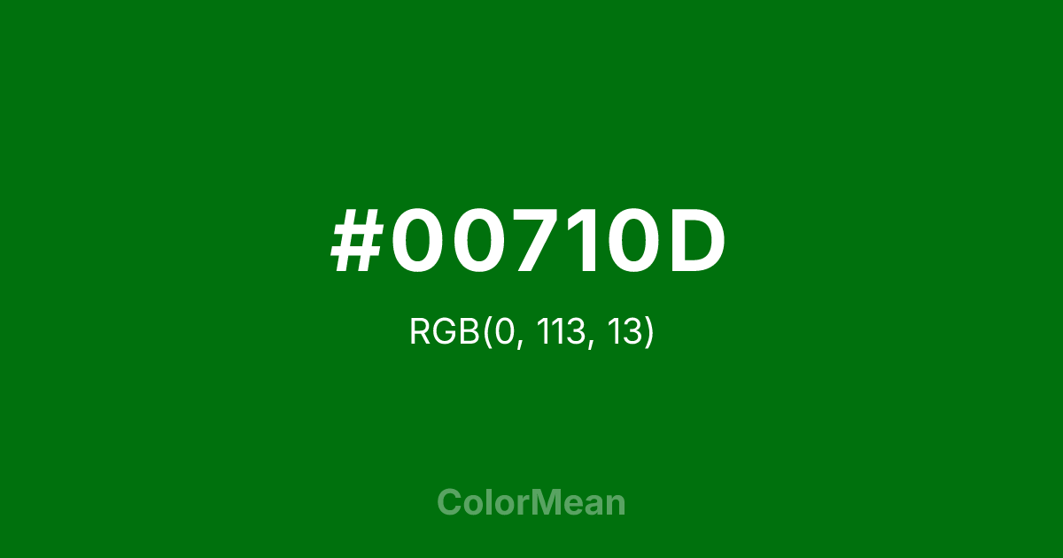 #00710D RGB value is (0, 113, 13). The hex color red value is 0, green is 113, and blue is 13. Its HSL format shows a hue of 127°, saturation of 100 percent, and lightness of 22 percent. The CMYK process values are 100 percent, 0 percent, 88 percent, 56 percent.