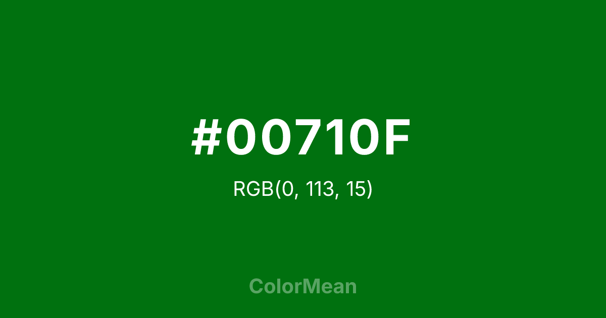 #00710F RGB value is (0, 113, 15). The hex color red value is 0, green is 113, and blue is 15. Its HSL format shows a hue of 128°, saturation of 100 percent, and lightness of 22 percent. The CMYK process values are 100 percent, 0 percent, 87 percent, 56 percent.