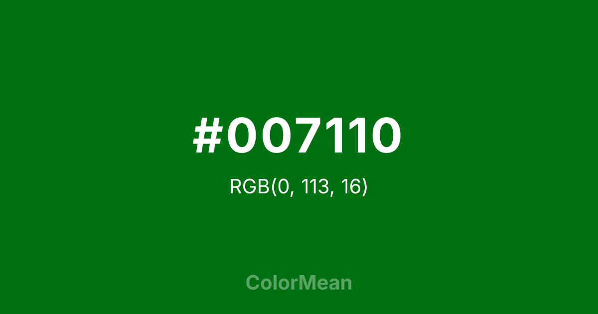 #007110 RGB value is (0, 113, 16). The hex color red value is 0, green is 113, and blue is 16. Its HSL format shows a hue of 128°, saturation of 100 percent, and lightness of 22 percent. The CMYK process values are 100 percent, 0 percent, 86 percent, 56 percent.