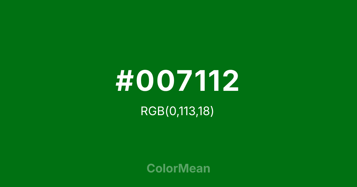 #007112 RGB value is (0, 113, 18). The hex color red value is 0, green is 113, and blue is 18. Its HSL format shows a hue of 130°, saturation of 100 percent, and lightness of 22 percent. The CMYK process values are 100 percent, 0 percent, 84 percent, 56 percent.