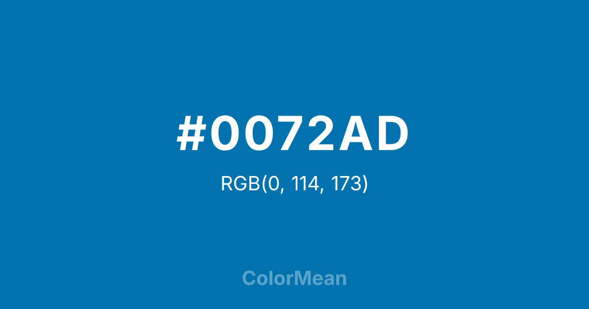 #0072AD RGB value is (0, 114, 173). The hex color red value is 0, green is 114, and blue is 173. Its HSL format shows a hue of 200°, saturation of 100 percent, and lightness of 34 percent. The CMYK process values are 100 percent, 34 percent, 0 percent, 32 percent.