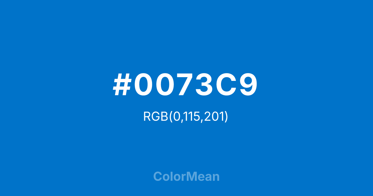 #0073C9 RGB value is (0, 115, 201). The hex color red value is 0, green is 115, and blue is 201. Its HSL format shows a hue of 206°, saturation of 100 percent, and lightness of 39 percent. The CMYK process values are 100 percent, 43 percent, 0 percent, 21 percent.