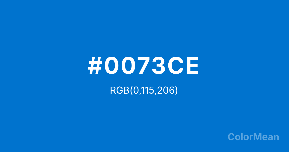 #0073CE RGB value is (0, 115, 206). The hex color red value is 0, green is 115, and blue is 206. Its HSL format shows a hue of 207°, saturation of 100 percent, and lightness of 40 percent. The CMYK process values are 100 percent, 44 percent, 0 percent, 19 percent.