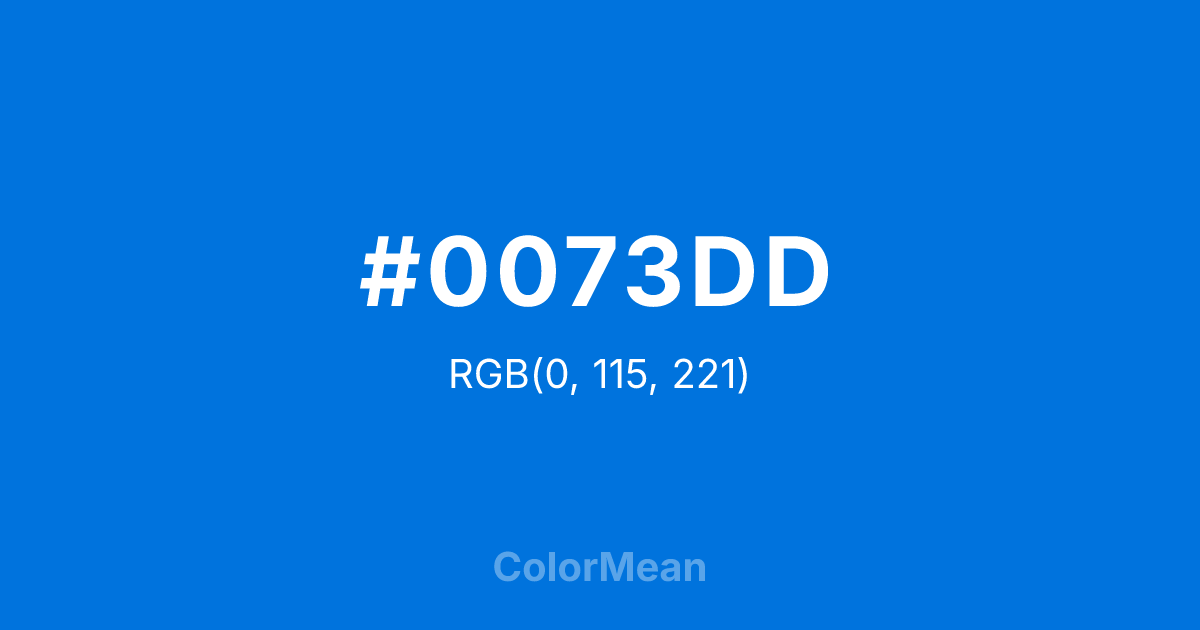 #0073DD RGB value is (0, 115, 221). The hex color red value is 0, green is 115, and blue is 221. Its HSL format shows a hue of 209°, saturation of 100 percent, and lightness of 43 percent. The CMYK process values are 100 percent, 48 percent, 0 percent, 13 percent.