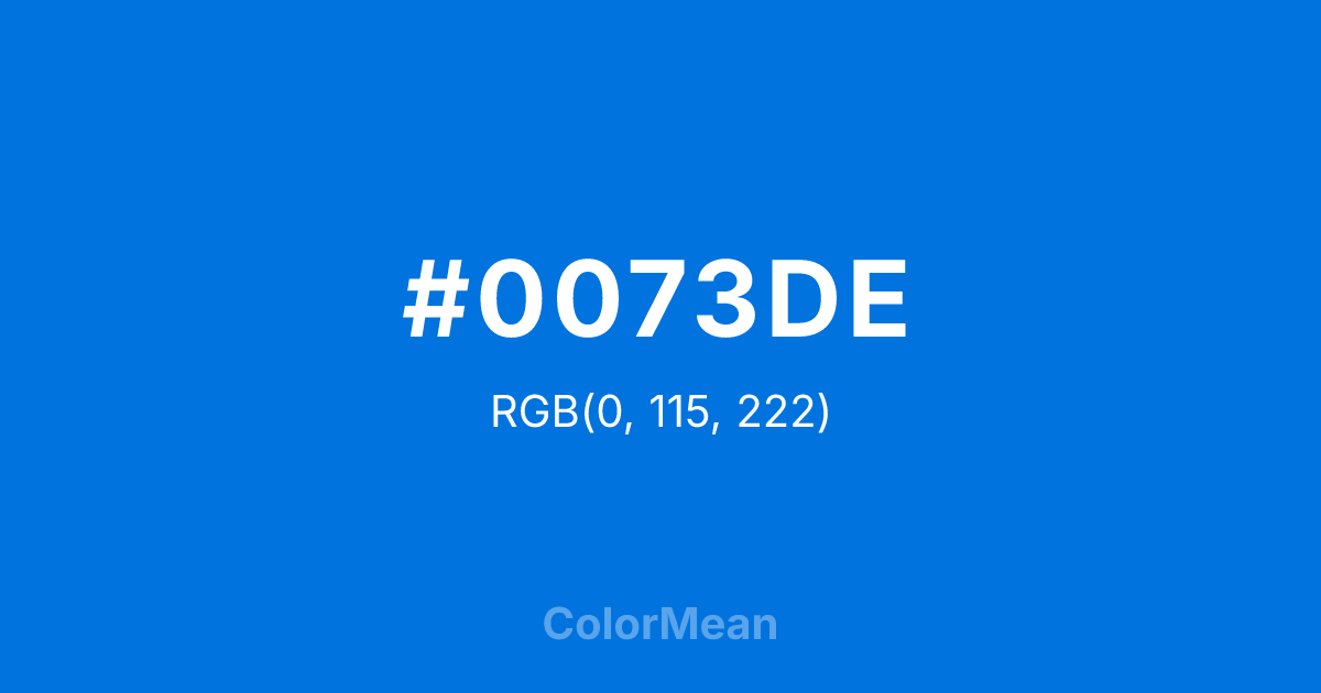 #0073DE RGB value is (0, 115, 222). The hex color red value is 0, green is 115, and blue is 222. Its HSL format shows a hue of 209°, saturation of 100 percent, and lightness of 44 percent. The CMYK process values are 100 percent, 48 percent, 0 percent, 13 percent.