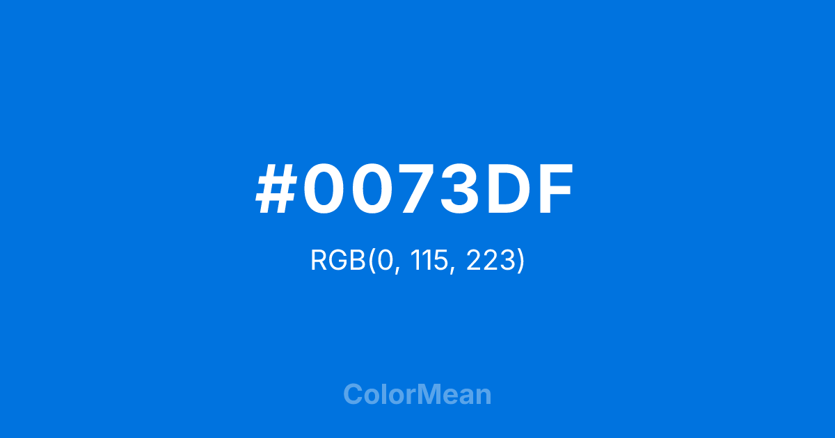 #0073DF RGB value is (0, 115, 223). The hex color red value is 0, green is 115, and blue is 223. Its HSL format shows a hue of 209°, saturation of 100 percent, and lightness of 44 percent. The CMYK process values are 100 percent, 48 percent, 0 percent, 13 percent.