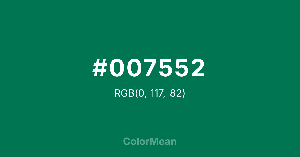 #007552 RGB value is (0, 117, 82). The hex color red value is 0, green is 117, and blue is 82. Its HSL format shows a hue of 162°, saturation of 100 percent, and lightness of 23 percent. The CMYK process values are 100 percent, 0 percent, 30 percent, 54 percent.