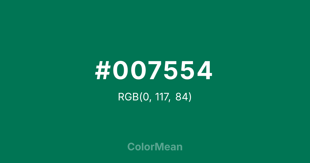 #007554 RGB value is (0, 117, 84). The hex color red value is 0, green is 117, and blue is 84. Its HSL format shows a hue of 163°, saturation of 100 percent, and lightness of 23 percent. The CMYK process values are 100 percent, 0 percent, 28 percent, 54 percent.