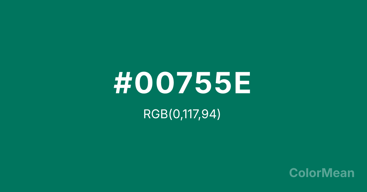 Tropical Rain Forest (#00755E) RGB value is (0, 117, 94). The hex color red value is 0, green is 117, and blue is 94. Its HSL format shows a hue of 168°, saturation of 100 percent, and lightness of 23 percent. The CMYK process values are 100 percent, 0 percent, 20 percent, 54 percent.