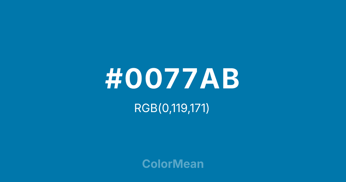 #0077AB RGB value is (0, 119, 171). The hex color red value is 0, green is 119, and blue is 171. Its HSL format shows a hue of 198°, saturation of 100 percent, and lightness of 34 percent. The CMYK process values are 100 percent, 30 percent, 0 percent, 33 percent.