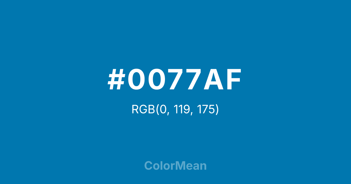#0077AF RGB value is (0, 119, 175). The hex color red value is 0, green is 119, and blue is 175. Its HSL format shows a hue of 199°, saturation of 100 percent, and lightness of 34 percent. The CMYK process values are 100 percent, 32 percent, 0 percent, 31 percent.