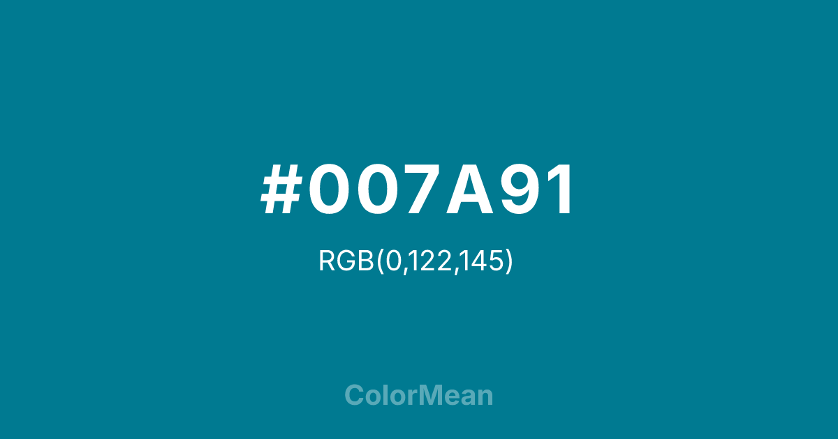 #007A91 RGB value is (0, 122, 145). The hex color red value is 0, green is 122, and blue is 145. Its HSL format shows a hue of 190°, saturation of 100 percent, and lightness of 28 percent. The CMYK process values are 100 percent, 16 percent, 0 percent, 43 percent.