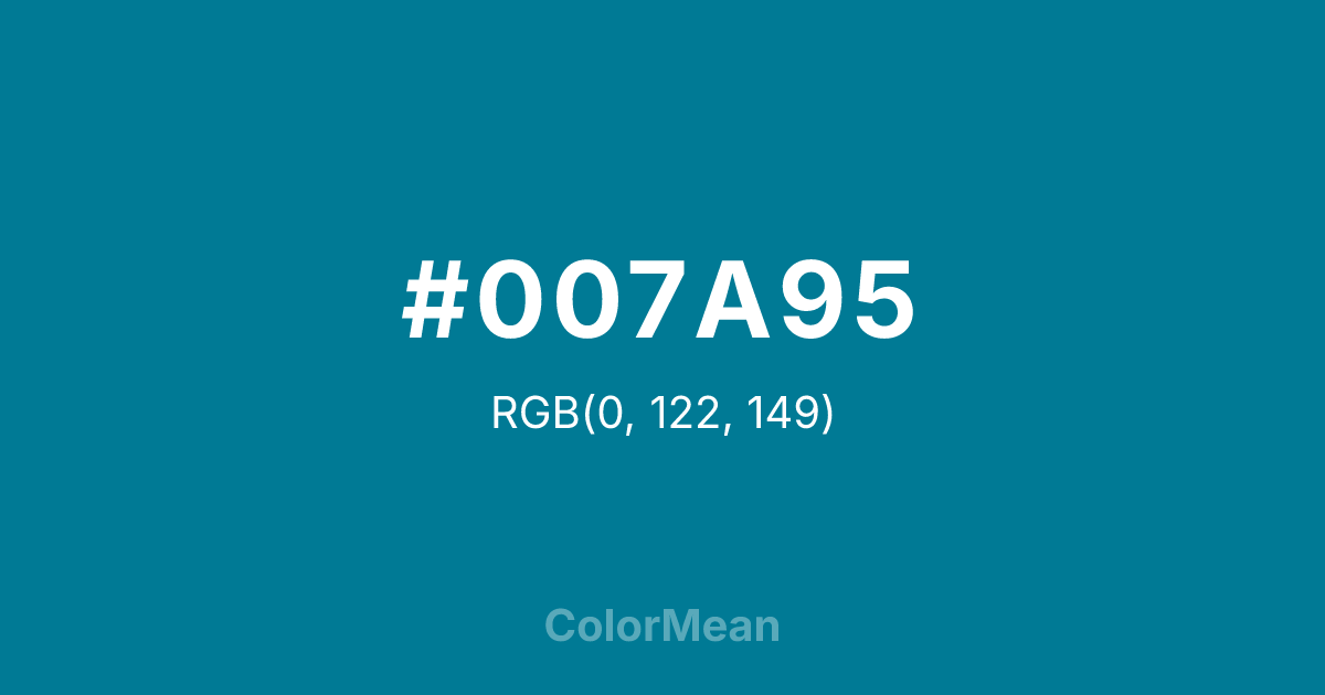 #007A95 RGB value is (0, 122, 149). The hex color red value is 0, green is 122, and blue is 149. Its HSL format shows a hue of 191°, saturation of 100 percent, and lightness of 29 percent. The CMYK process values are 100 percent, 18 percent, 0 percent, 42 percent.