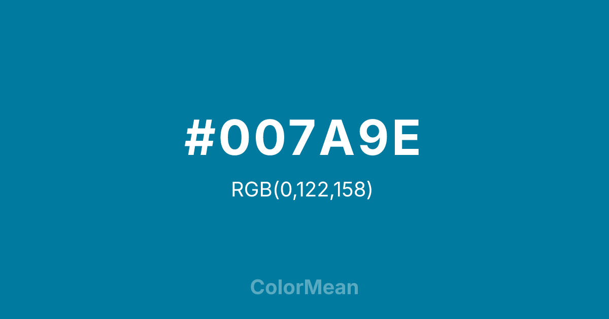#007A9E RGB value is (0, 122, 158). The hex color red value is 0, green is 122, and blue is 158. Its HSL format shows a hue of 194°, saturation of 100 percent, and lightness of 31 percent. The CMYK process values are 100 percent, 23 percent, 0 percent, 38 percent.