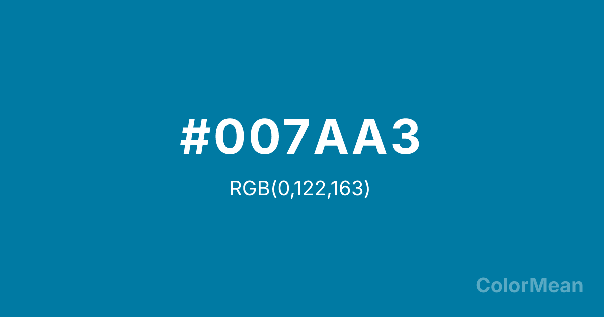 #007AA3 RGB value is (0, 122, 163). The hex color red value is 0, green is 122, and blue is 163. Its HSL format shows a hue of 195°, saturation of 100 percent, and lightness of 32 percent. The CMYK process values are 100 percent, 25 percent, 0 percent, 36 percent.