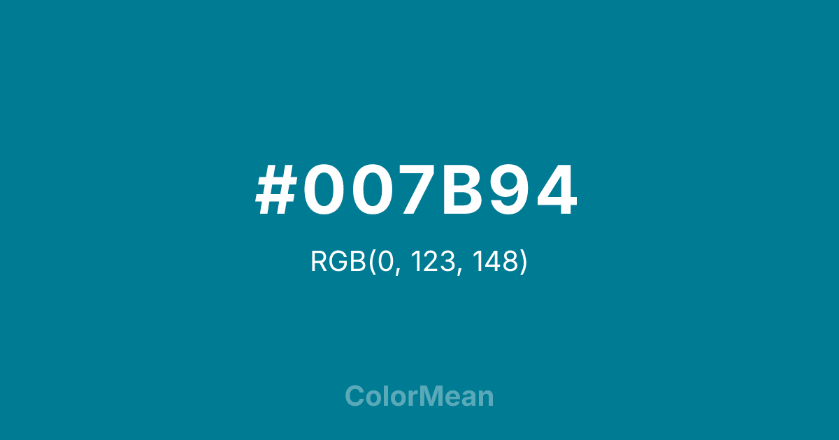 #007B94 RGB value is (0, 123, 148). The hex color red value is 0, green is 123, and blue is 148. Its HSL format shows a hue of 190°, saturation of 100 percent, and lightness of 29 percent. The CMYK process values are 100 percent, 17 percent, 0 percent, 42 percent.