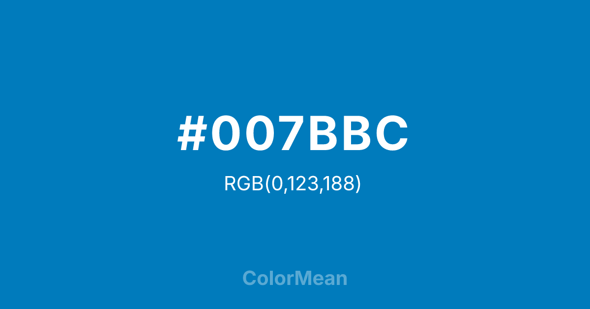 #007BBC RGB value is (0, 123, 188). The hex color red value is 0, green is 123, and blue is 188. Its HSL format shows a hue of 201°, saturation of 100 percent, and lightness of 37 percent. The CMYK process values are 100 percent, 35 percent, 0 percent, 26 percent.