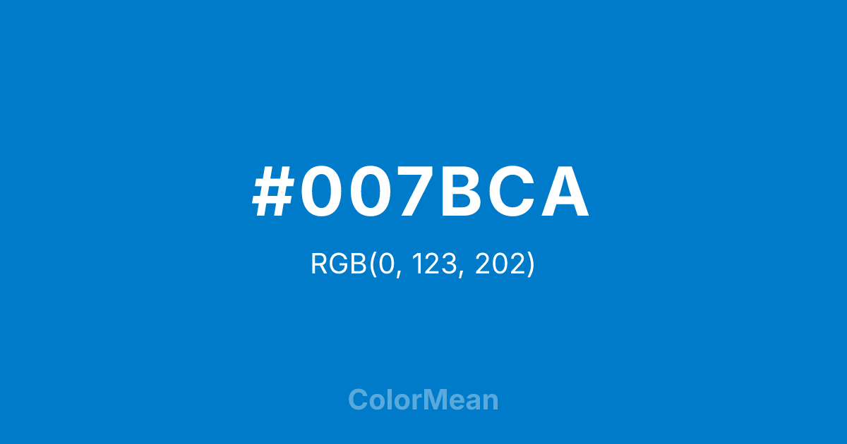 #007BCA RGB value is (0, 123, 202). The hex color red value is 0, green is 123, and blue is 202. Its HSL format shows a hue of 203°, saturation of 100 percent, and lightness of 40 percent. The CMYK process values are 100 percent, 39 percent, 0 percent, 21 percent.