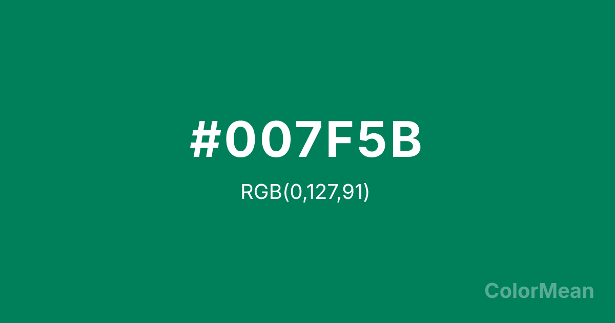 #007F5B RGB value is (0, 127, 91). The hex color red value is 0, green is 127, and blue is 91. Its HSL format shows a hue of 163°, saturation of 100 percent, and lightness of 25 percent. The CMYK process values are 100 percent, 0 percent, 28 percent, 50 percent.
