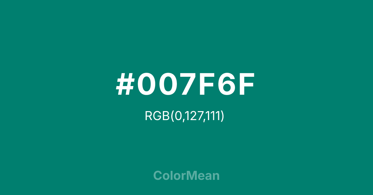 #007F6F RGB value is (0, 127, 111). The hex color red value is 0, green is 127, and blue is 111. Its HSL format shows a hue of 172°, saturation of 100 percent, and lightness of 25 percent. The CMYK process values are 100 percent, 0 percent, 13 percent, 50 percent.