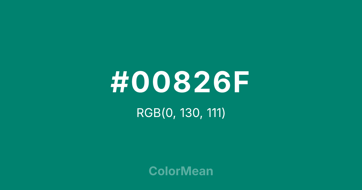 #00826F RGB value is (0, 130, 111). The hex color red value is 0, green is 130, and blue is 111. Its HSL format shows a hue of 171°, saturation of 100 percent, and lightness of 25 percent. The CMYK process values are 100 percent, 0 percent, 15 percent, 49 percent.