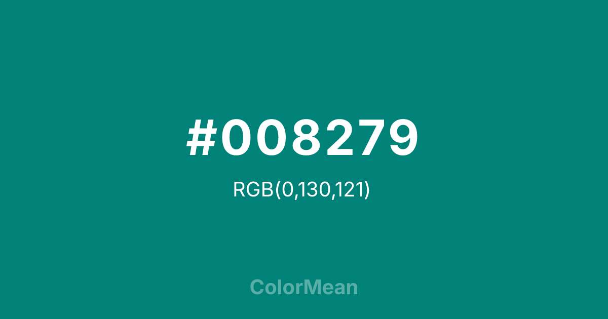#008279 RGB value is (0, 130, 121). The hex color red value is 0, green is 130, and blue is 121. Its HSL format shows a hue of 176°, saturation of 100 percent, and lightness of 25 percent. The CMYK process values are 100 percent, 0 percent, 7 percent, 49 percent.