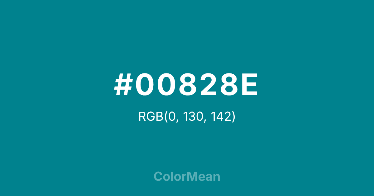 #00828E RGB value is (0, 130, 142). The hex color red value is 0, green is 130, and blue is 142. Its HSL format shows a hue of 185°, saturation of 100 percent, and lightness of 28 percent. The CMYK process values are 100 percent, 8 percent, 0 percent, 44 percent.