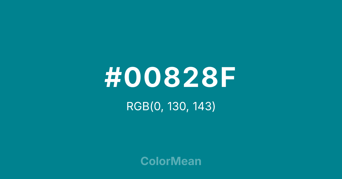#00828F RGB value is (0, 130, 143). The hex color red value is 0, green is 130, and blue is 143. Its HSL format shows a hue of 185°, saturation of 100 percent, and lightness of 28 percent. The CMYK process values are 100 percent, 9 percent, 0 percent, 44 percent.