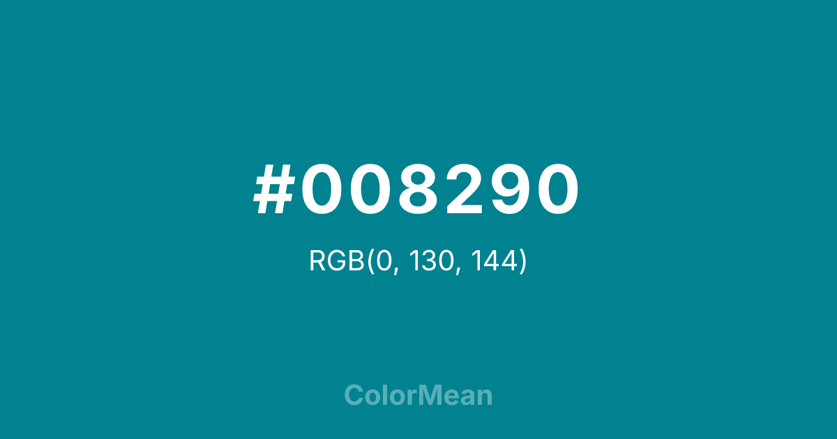 #008290 RGB value is (0, 130, 144). The hex color red value is 0, green is 130, and blue is 144. Its HSL format shows a hue of 186°, saturation of 100 percent, and lightness of 28 percent. The CMYK process values are 100 percent, 10 percent, 0 percent, 44 percent.
